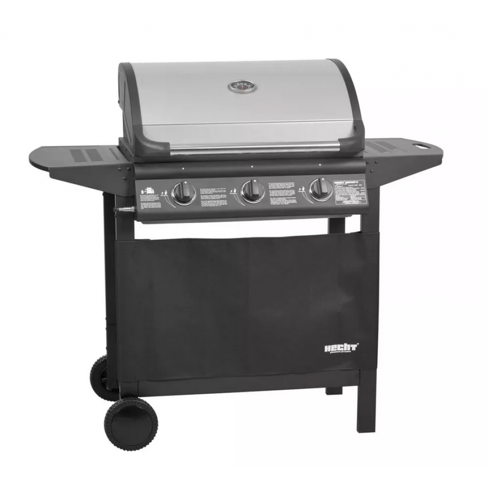 Газовий гриль з 3 основними горілками, загальною потужністю 10,5 кВт. Решітка з чавуну. Загальний розмір поверхні гриля - 62 х 42 см. Висота поверхні гриля над землею становить 81 см. Гриль закритий кришкою, висота грилю 104 см, довжина 123 см і ширина 53 см.