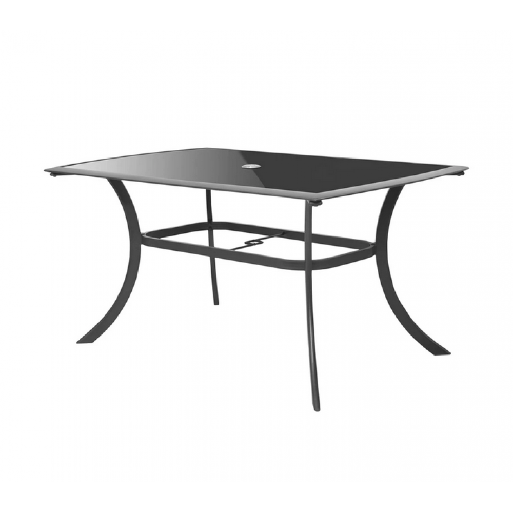 Виготовлений із алюмінієвих профілів з обробкою поверхні комакситом. Стіл із загартованим чорним склом. Підходить для інтер'єру та інтер'єру. Не підходить для використання у вологому середовищі. Ш150хГ90хВ72 см
