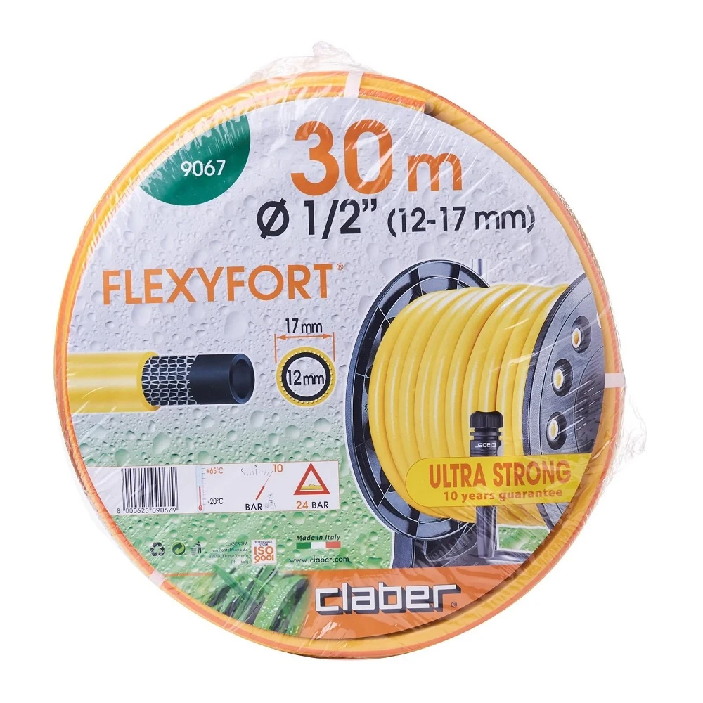 Садовий шланг Claber Flexyfort 9067 - жовтий шланг з ПВХ довжиною 30 м і діаметром 1/2 дюйма, який виготовлений спеціально для поливу зелених насаджень на городі або в саду. Поливальний шланг просто незамінний в спекотну погоду або ж під час літньої посухи, коли дощу немає протягом тривалого часу.