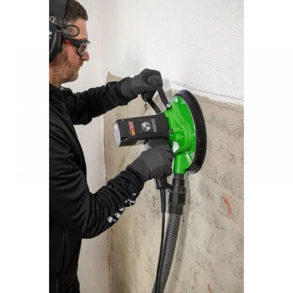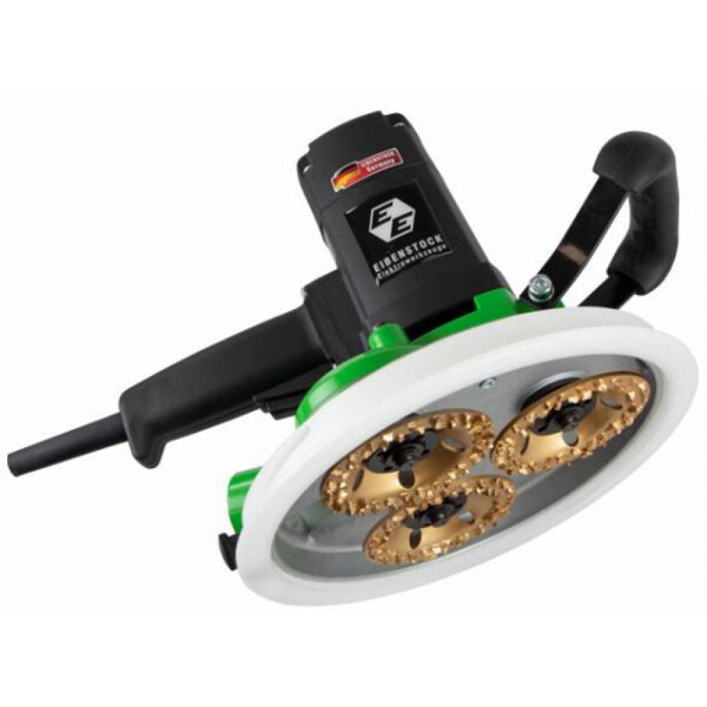 Модель EPF 200-3 від бренду Eibenstock ефективно справляється з чорновою обробкою поверхонь та видалення старих покриттів (фарби, плиткового клею, штукатурки, шпалер та інших твердих матеріалів). Тридискова конструкція шліфувальної машини з діаметром фрез 100 мм створює робочу зону шириною 200 мм, надаючи високу продуктивність при підготовці поверхонь перед ремонтом. Двигун потужністю 1.5 кВт і плавний запуск дозволяють виконувати роботи зі швидкістю обертання дисків до 3000 об/хв, запобігаючи також ривкам на початку роботи, забезпечуючи рівномірний рух фрез.