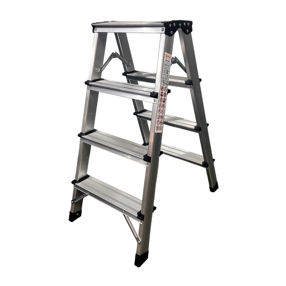 GTM KMH1204- компактна алюмінієва драбина у формі двосторонньої стрем'янки, яка чудово підходить як для побутового, так і для професійного використання. У даній моделі драбини 4 сходинки і максимальна висота до верхньої сходинки 78 см.