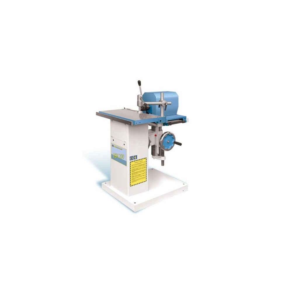 Свердлильно-пазувальний деревообробний верстат. Серійний верстат з одним ексцентриковим затискачем і захисним кожухом для двигуна. Фіксування довжини і глибини свердління. Опорний важіль для серійної роботи. Свердлильна головка з можливістю нахилу. Патрон Westcott 0 — 20 мм з захисною кришкою. Швидка настройка по висоті маховиком. Легке переміщення свердлильної головки одним важелем.