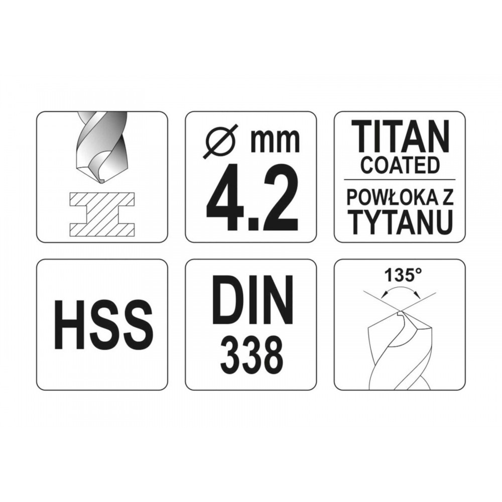 Свердло по металу YATO YT-44642 виготовлено з високоякісної швидкоріжучої сталі HSS. Призначено для професійного, промислового використання – свердління нержавіючої сталі, конструкційної та холоднокатаної сталі.