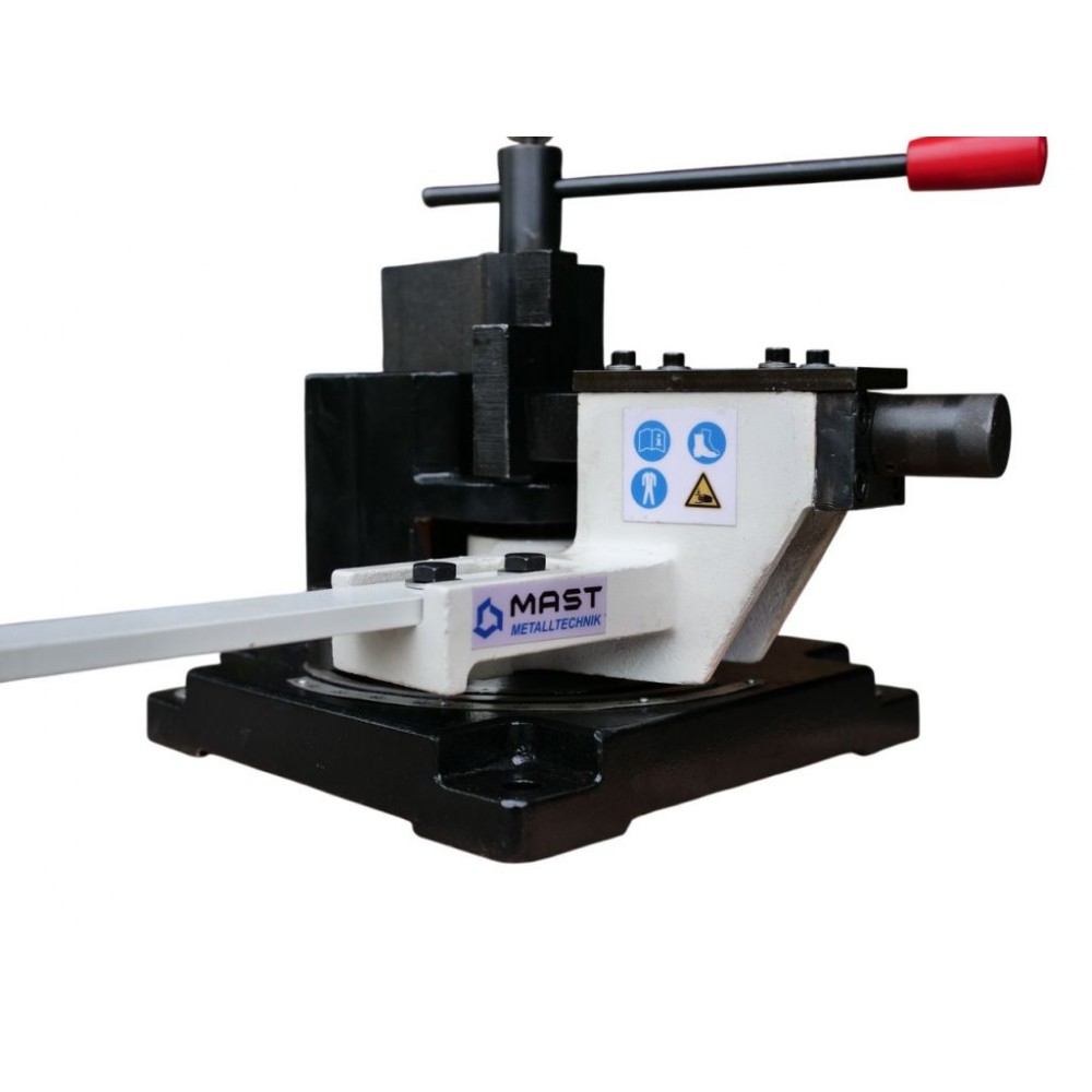 Універсальний листозгинальний верстат MAST Metalltechnik M-UB100A — це компактний ручний пристрій для холодного і гарячого згинання листового металу та профілю круглого і квадратного перетину. Монтажні отвори в станині дозволяють надійно закріпити верстат на верстаку чи іншій робочій поверхні, а довгий важіль з прогумованим хватом створює зусилля згинання без великого фізичного навантаження на оператора. Максимальний кут згину становить 120°.