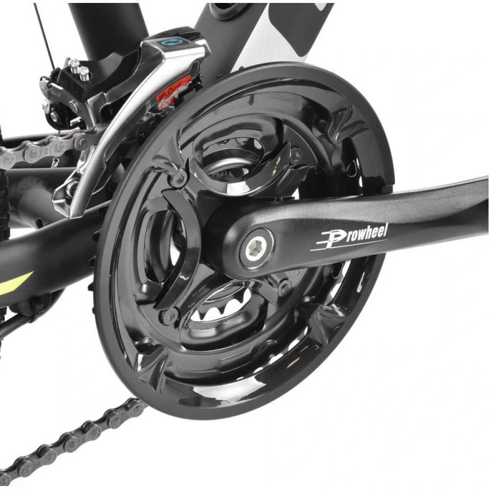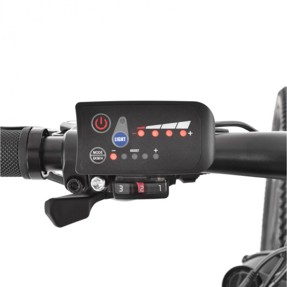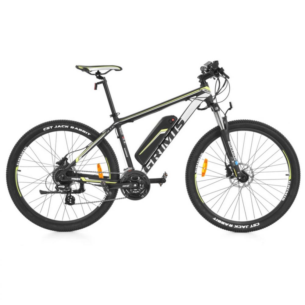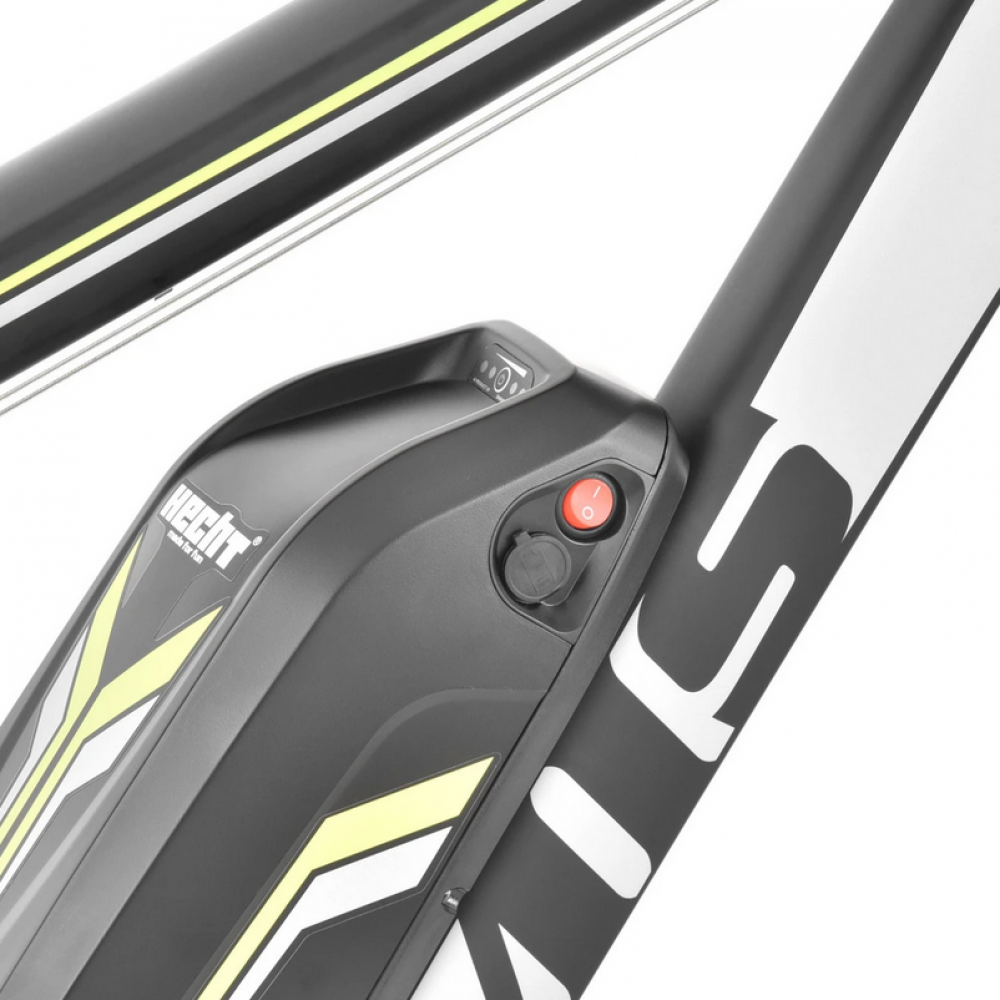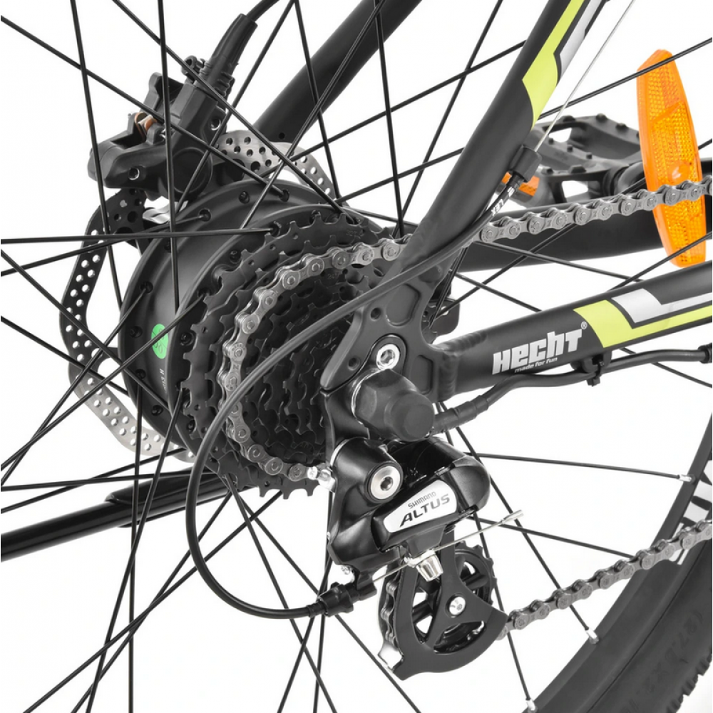 Спортивний відкритий електровелосипед HECHT GRIMIS GREEN. Перемикач Shimano. Передня підвіска регульована вилка. Дискові гальма. Алюмінієва рама 18" з акумулятором 36 В/14 Ач. Мотор 250 Вт, колеса 27,5", вага 20,5 кг. Запас ходу електромотора до 110 км. Електродвигун включається автоматично, як тільки ви наступаєте на педалі. Отже, електровелосипед не працює як мотоцикл, але він дуже допомагає вам крутити педалі. Кнопки на лівому кермі можна використовувати для встановлення рівнів, у яких вам допоможе мотор. За допомогою двигуна можна легко піднятися на гірку, яка змусить спітніти навіть найзагартованіших спортсменів. Ви також можете вимкнути допомогу електромотора.