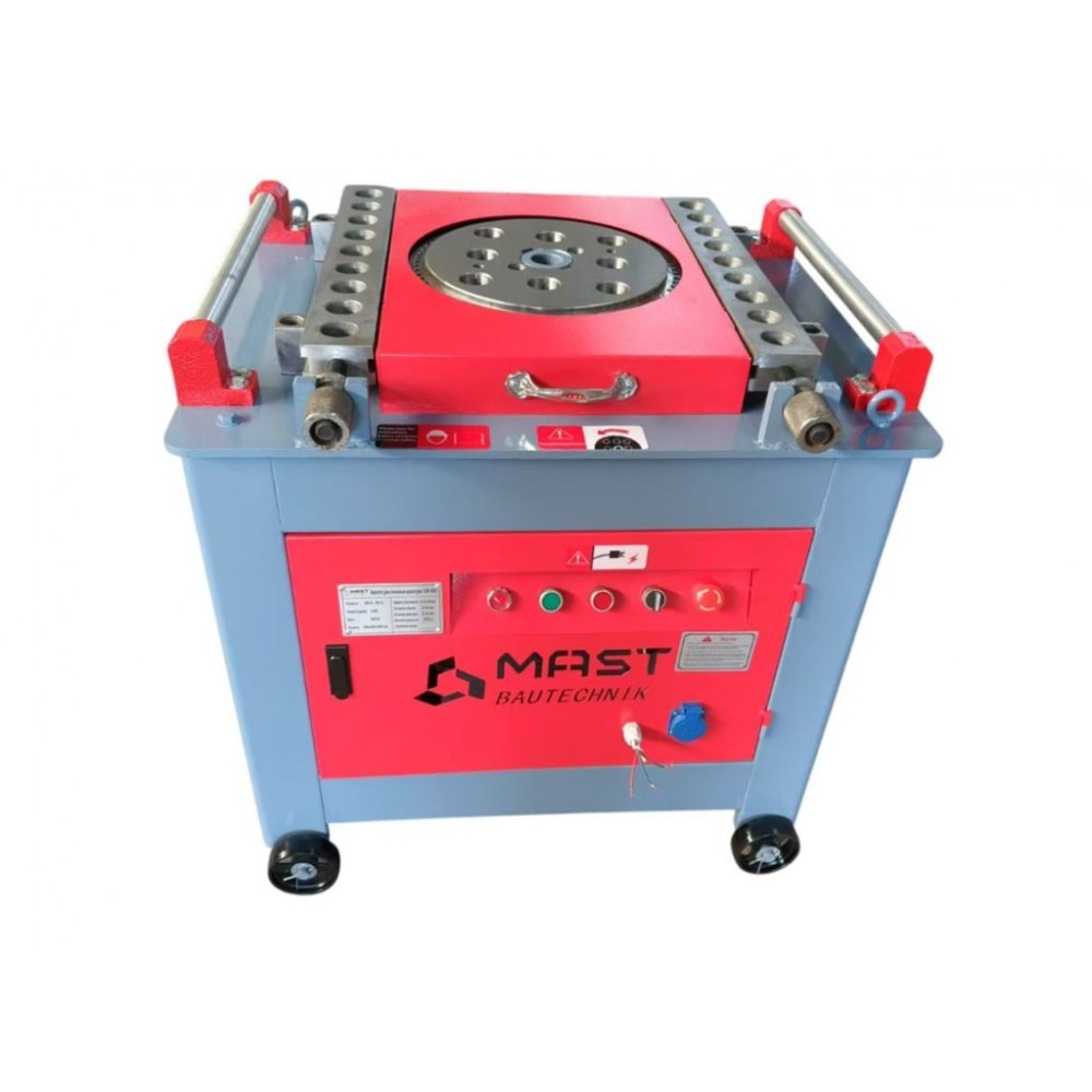 Верстат для згинання арматури MAST Bautechnik GW50A використовується для згинання арматури діаметром 6–42 мм і сталевих прутків (класи А1, А3, А500С) діаметром 6–50 мм. Перевагою моделі є два режими керування: ручний (кнопковий) та автоматичний (педальний). В автоматичному режимі після одноразового натискання педалі диск обертається на заданий кут і автоматично повертається у вихідне положення, що дає змогу виконувати серійне згинання з високою точністю.