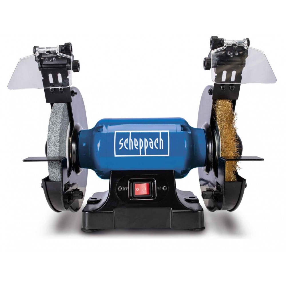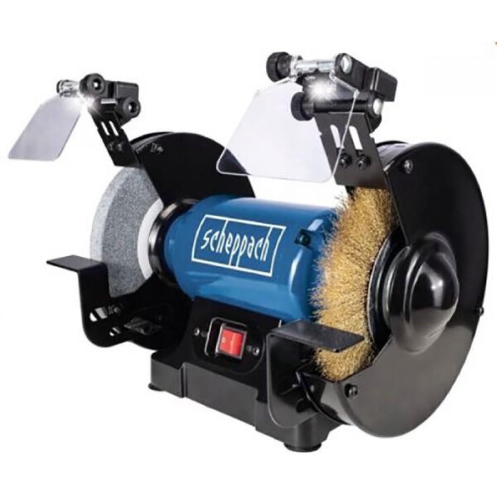 Scheppach SM200LB - багатофункціональний шліфувально-полірувальний верстат, призначений для обробки, заточування матеріалів. Має подвійний функціонал, оснащений шліфувальним кругом K36 і щітковим зачистним диском, ідеальний для різноманітних робіт, включаючи чищення та підготовку до зварювальних робіт.