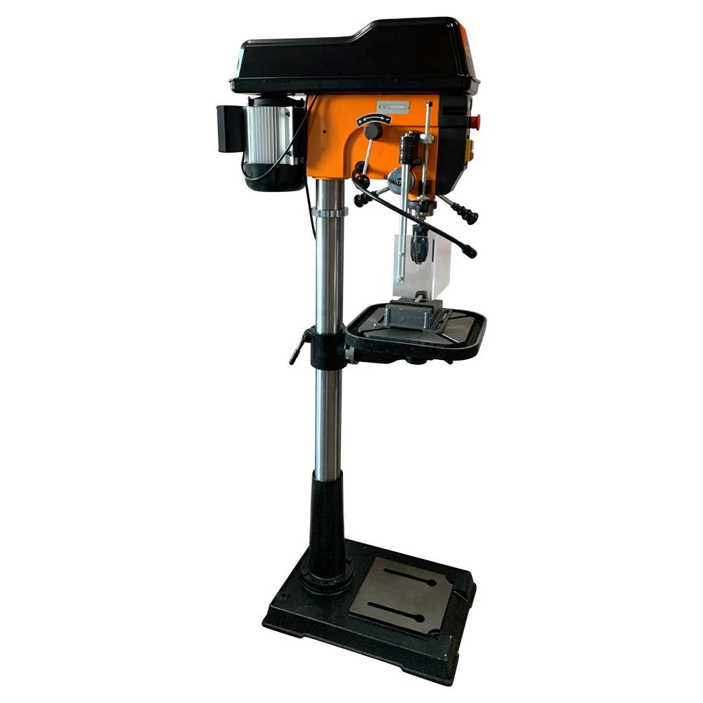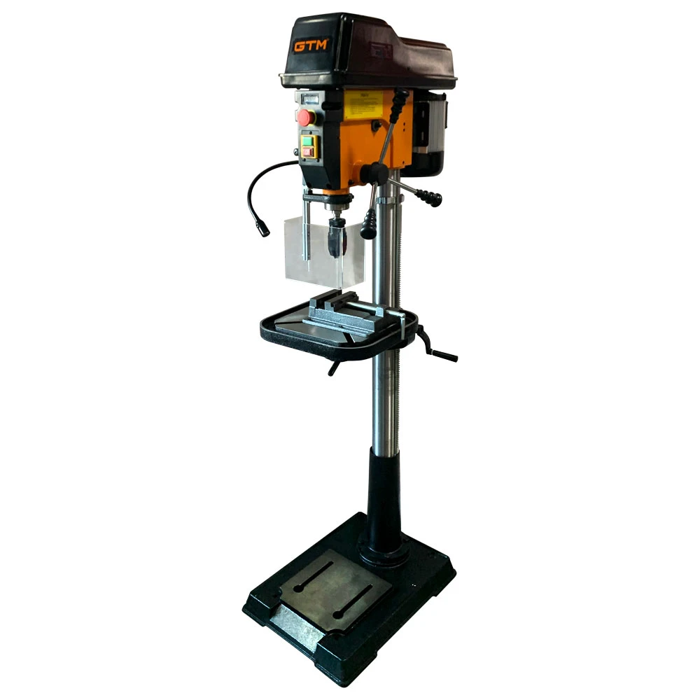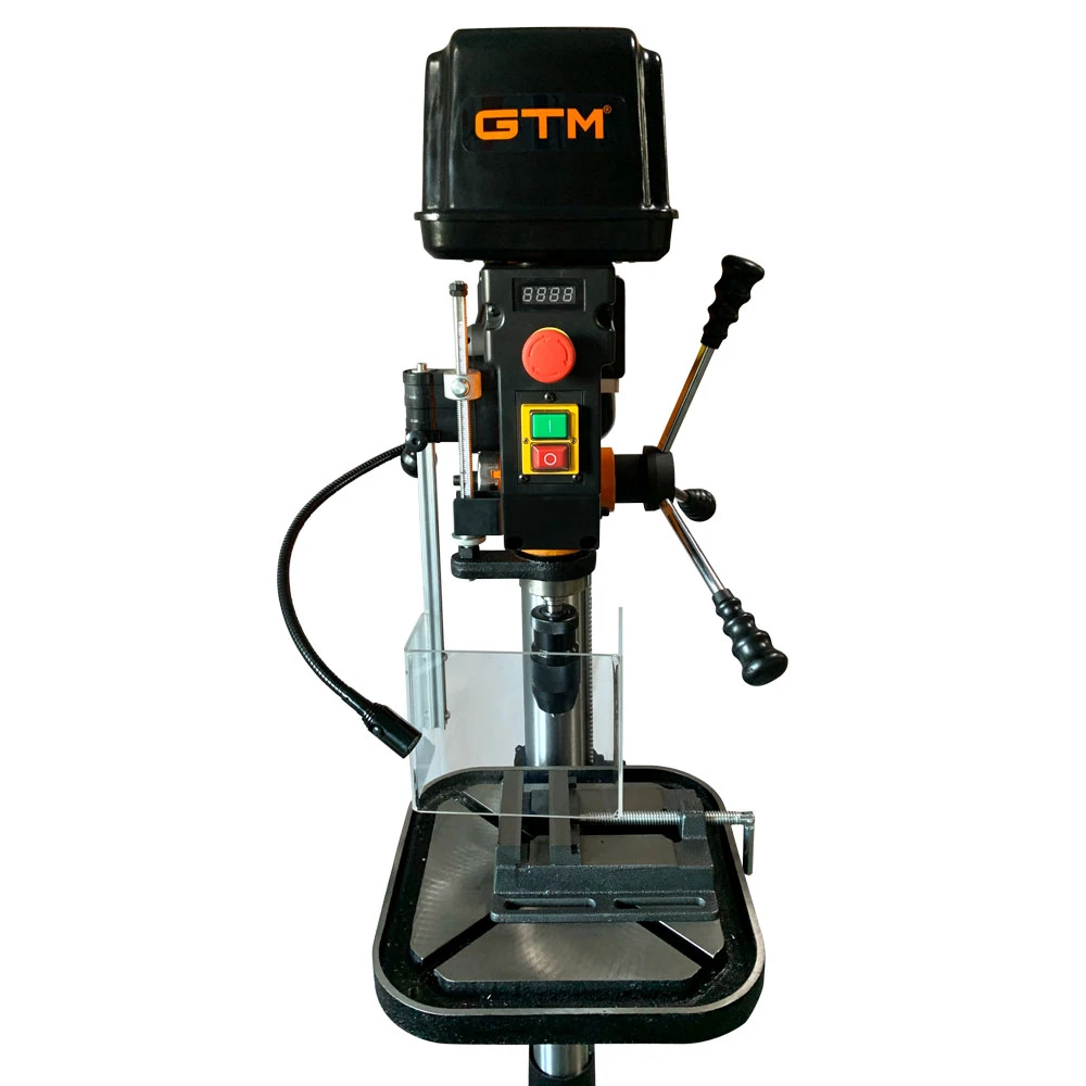 Верстат свердлильний GTMDB430 - професійне електричне обладнання для свердління глухих і наскрізних отворів в металевих, дерев'яних, пластикових і кам'яних деталях. Залежно від поставленного завдання може працювати з різними свердлами, зенкерами, розгорненнями, мітчиками і іншим інструментом. Дана модель має підлогове виконання. Залежно від типу матеріалу, товщини або свердла, користувач може плавно налаштувати швидкість обертання патрона від 440 до 2100 об / хв. Для більшої зручності в конструкції передбачений цифровий індикатор поточної швидкості. Верстат комплектується лещатами розміром 125 мм, які розміщені на робочому майданчику. Залежно від деталі майданчик здатен обертатися на 360 градусів, підніматися або опускатися. GTMDB430 комплектується металевим швидкозажимним патроном на 16 мм і захисним екраном, для запобігання травм при роботі.