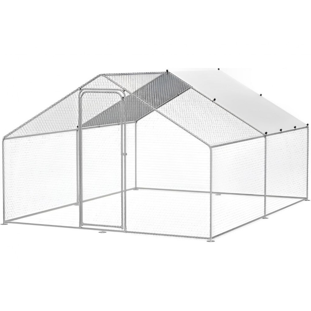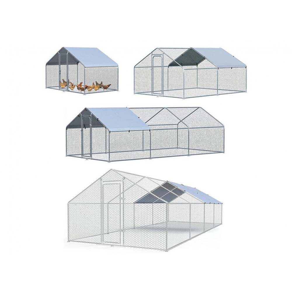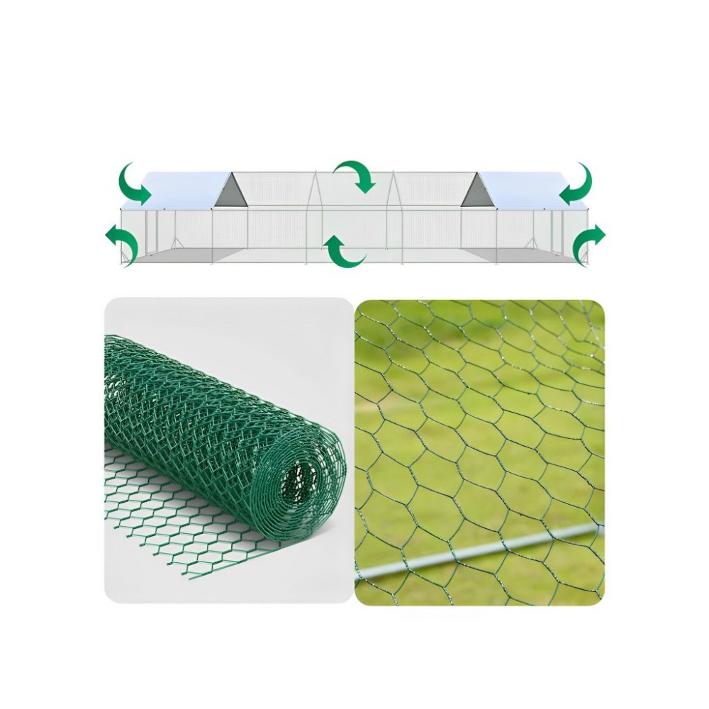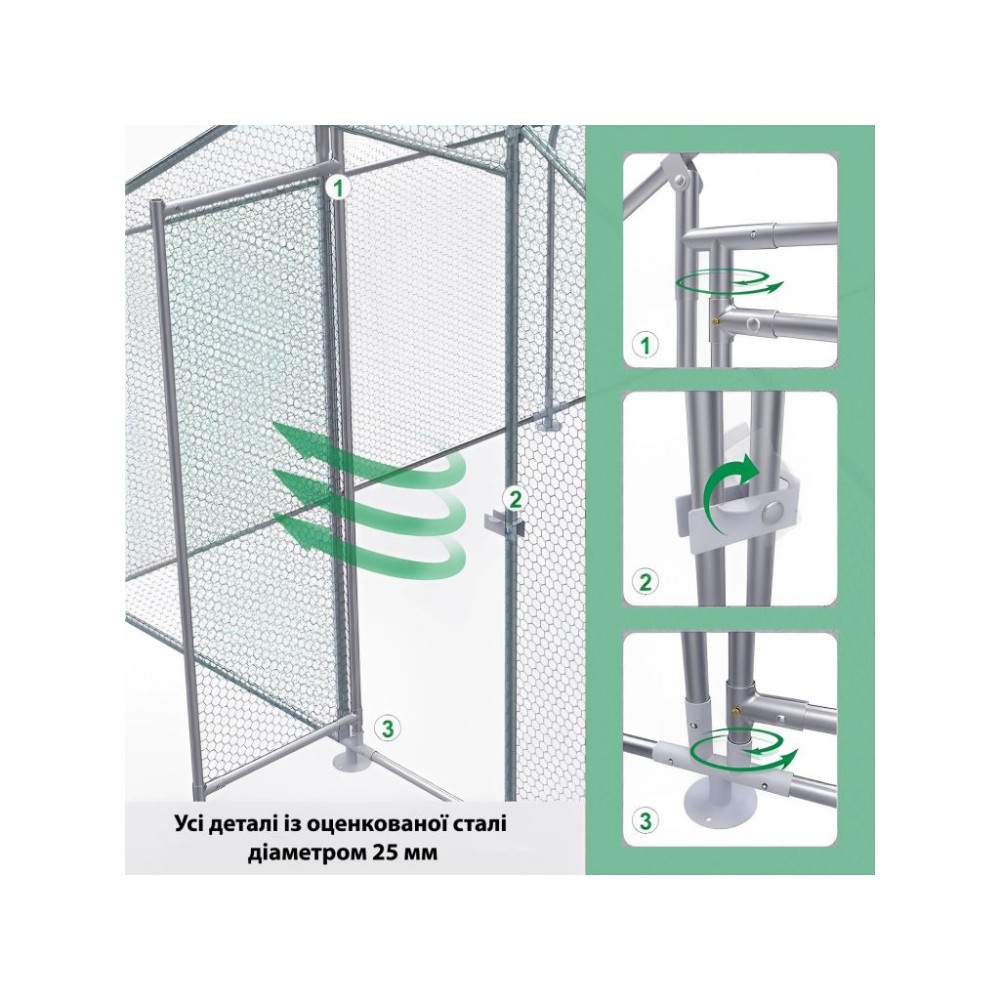 Рама виготовлена з оцинкованої металевої труби діаметром 25 мм. Оцинкована сталева сітка з ПВХ покриттям і отворами 0,9 мм стійка до розриву і клювання, що унеможливлює втечу птиці та проникнення у вольєр хижаків. Накриття наполовину сітчасте, а друга половина - з водонепроникного, УФ-стійкого матеріалу. Для покращення стійкості є фіксатори опор до грунту. Компактність у складеному вигляді дозволяє без проблем перевозити цей модульний вольєр для птиці та зручно його зберігати, коли немає потреби у використанні.