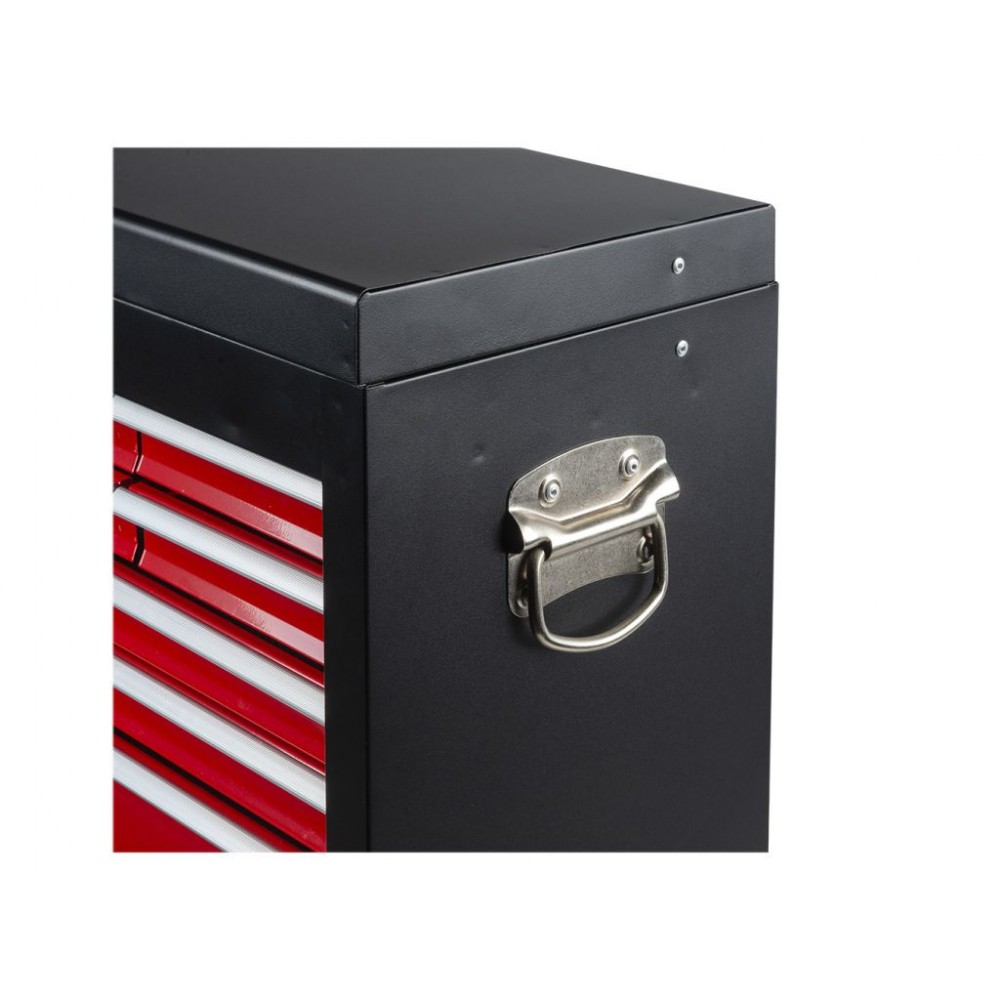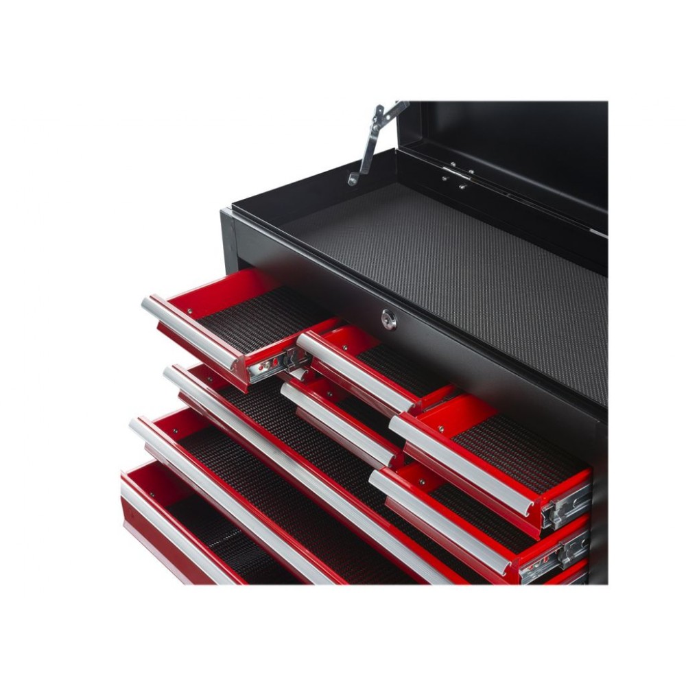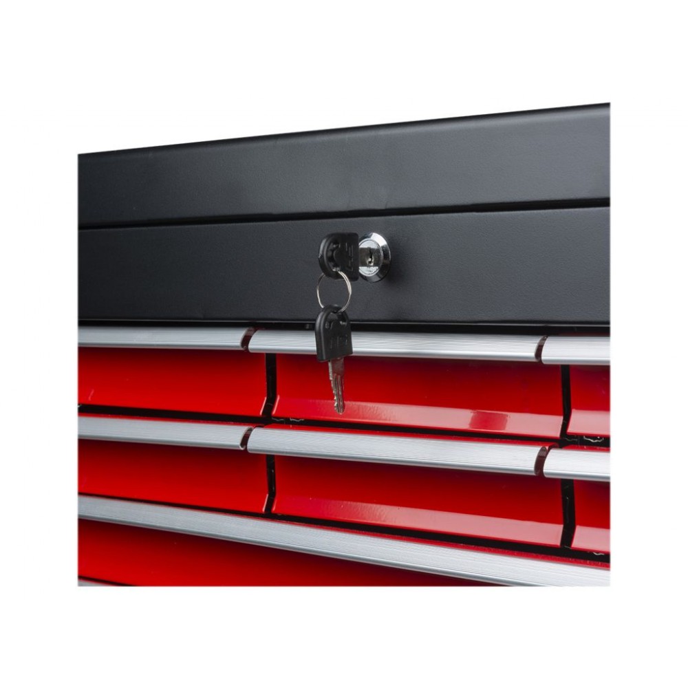 6 шухляд мають розмір 150x225x40 мм, 2 шухляди - 511x225x40 мм, а нижня шухляда - 511x22 x84 мм. Всі шухляди легко висуваються завдяки високоякісним кульковим підшипникам і закриваються на центральний замок, а поролонові вставки запобігають переміщенню інструменту під час транспортування. Верхній відсік з відкидною кришкою забезпечує додаткове місце для зберігання.Стійкі до пошкоджень і зношування матеріали виготовлення гарантують, що цей ящик для інструменту служитиме довго та надійно.