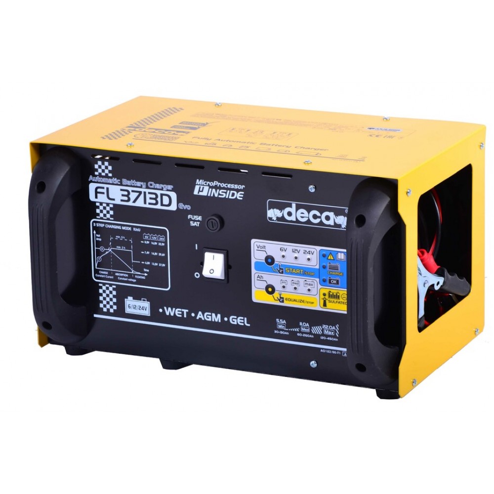 Серія FL зарядних пристроїв DECA містить кілька моделей різної потужності. Найбільш потужною є модель DECA FL 3713D, яка призначена для заряду акумуляторних батарей великої ємності для великогабаритної автомобільної техніки, екскаваторів, тягачів тощо. Пристрої цієї серії відрізняються повністю автоматичним процесом заряджання, якістю виконання, наявністю електронної системи управління. Як і інші зарядні пристрої цієї серії, може заряджати батареї з вихідною напругою: 6, 12 та 24 вольти. Потужний зарядний пристрій DECA FL 3713D можна використовувати для заряджання та обслуговування акумуляторів з ємністю від 30 до 450 ампер-годин. Можливість роботи з акумуляторами великої ємності обумовлена особливостями конструкції приладу, де використано потужний трансформатор та напівпровідникову схему випрямлення. Також реалізовано схему стабілізації вихідного струму, згладжування пульсацій за допомогою фільтрів та мікропроцесорного управління. DECA FL 3713D працює в автоматичному режимі і тому його можна використовувати для заряджання гелевих та сухих акумуляторів, а також звичайних WET-батарей. Залежно від типу батареї зарядний пристрій підлаштовує величину зарядного струму та напруги, яка може становити 6, 12 та 24 вольти. Для зручності транспортування зарядки призначені спеціальні ручки, які виготовлені із шорсткого пластику.