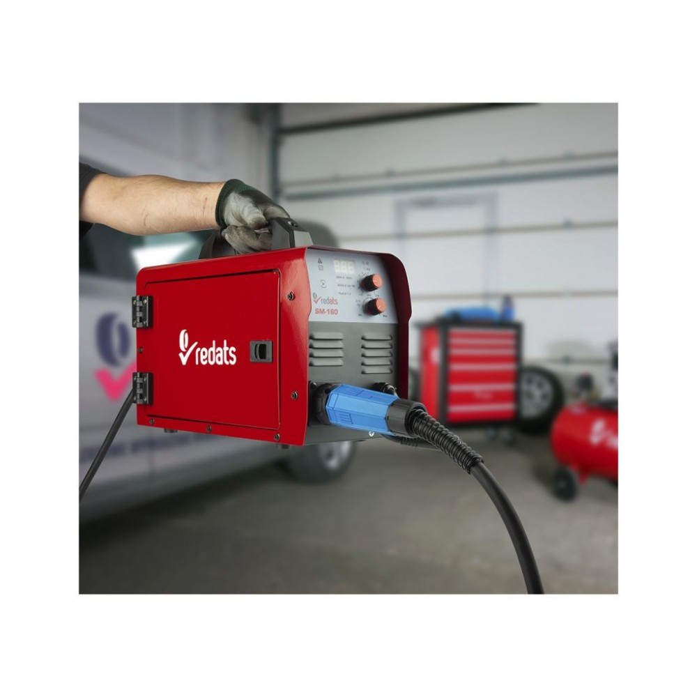 Зварювальний апарат REDATS SM-160 MIG/MAG, Lift TIG, MMA, дріт Flux - це багатофункціональне обладнання, що підтримує 3 методи зварювання: MMA (штучно покритим електродом), MIG/MAG (в середовищі захисного газу) і TIG Lift (неплавким вольфрамовим електродом). Дозволяє працювати з різними матеріалами товщиною 1-6 мм. Працює на основі інверторної технології, яка забезпечує стабільність зварювального струму і знижене споживання електроенергії. Живлення від мережі 230 В.